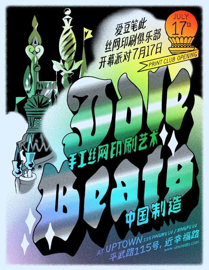 从2009年开始,爱豆笔此双人组一直致力于原创版画艺术的创作和丝网技术的推广。6年后的今天,他们带来Print Club的全新概念,在上海市中心的地下空间开创中国第一个开放丝印俱乐部。作为IdleBeats的分支,Print Club提供工作坊、现场印刷活动以及部分印刷服务。